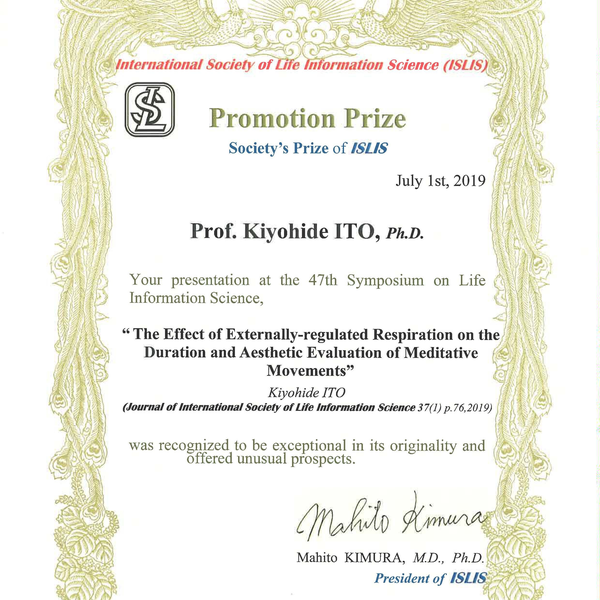 2019/03/31 2019年3月31日、国際生命情報科学会(ISLIS)第47回大会において、ISLIS奨励発表賞を受賞しました。 2019年3月9日~10日に開催されたISLIS第47回大会において発表した「呼吸の外的制約が meditative movement の所要時間、美的評価に及ぼす効果」が、ISLIS奨励発表賞を受賞しました。 前の記事へ 記事一覧 次の記事へ